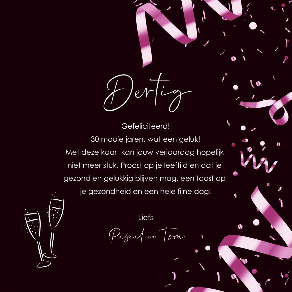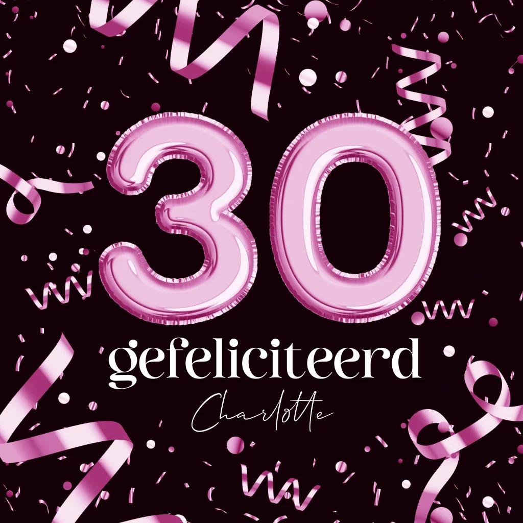 Ee feestelijke verjaardagskaart speciaal vrouw voor iemand die 30 jaar wordt! Met ballonnen 30, slingers en confetti roze.