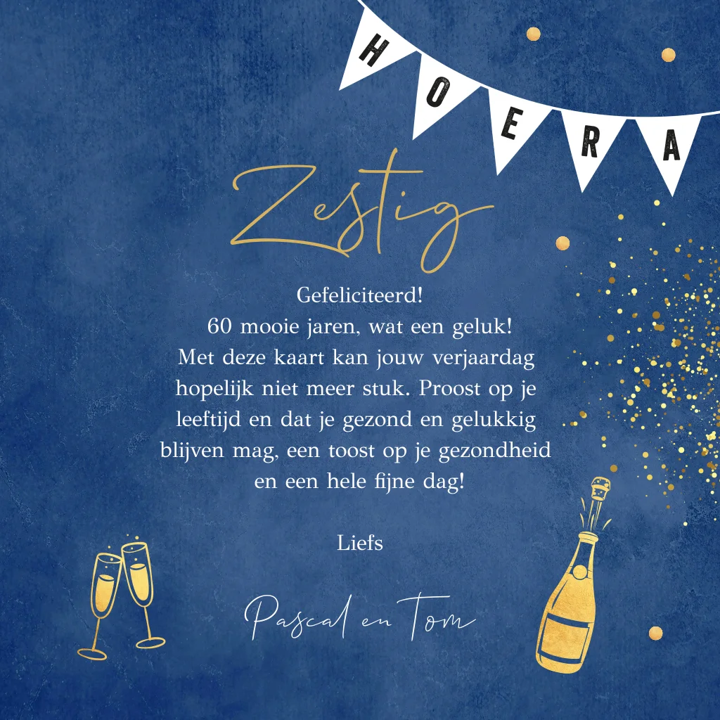 Een feestelijke verjaardagskaart blauw speciaal voor iemand die 60 jaar wordt! Met foto's, slinger en goudlook.