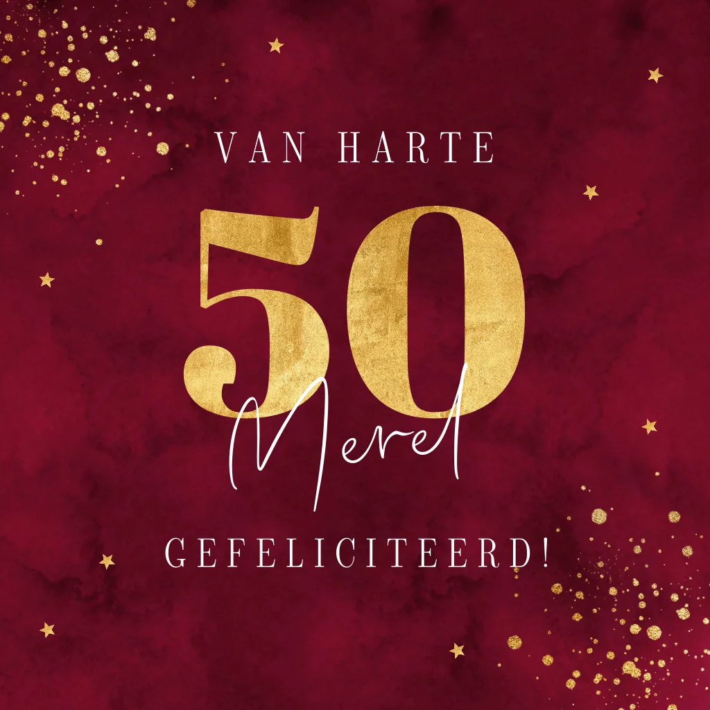 Verjaardagskaart voor een vrouw rood met jaartal 50 jaar in goud look.