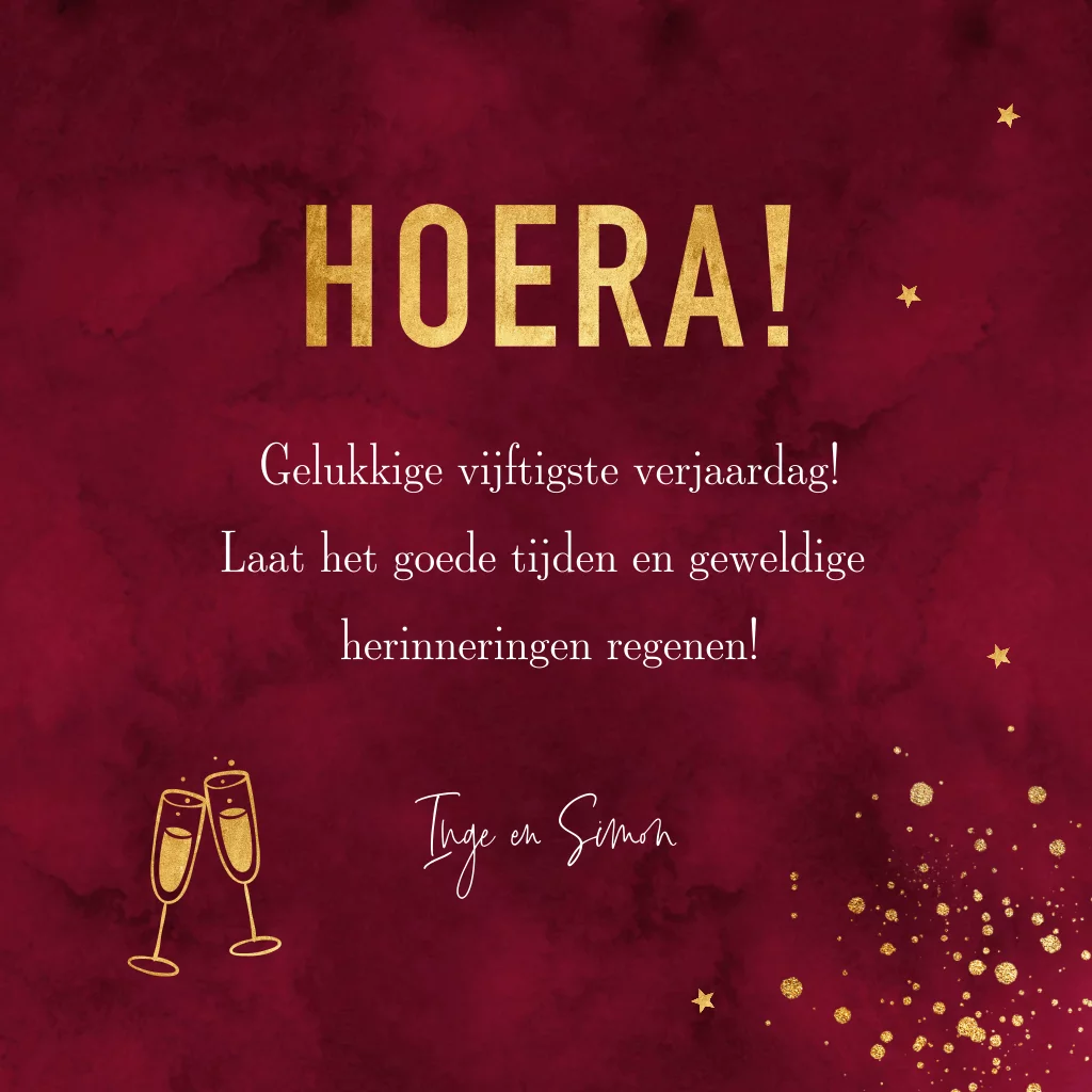 Verjaardagskaart vrouw rood 50 jaar goud look