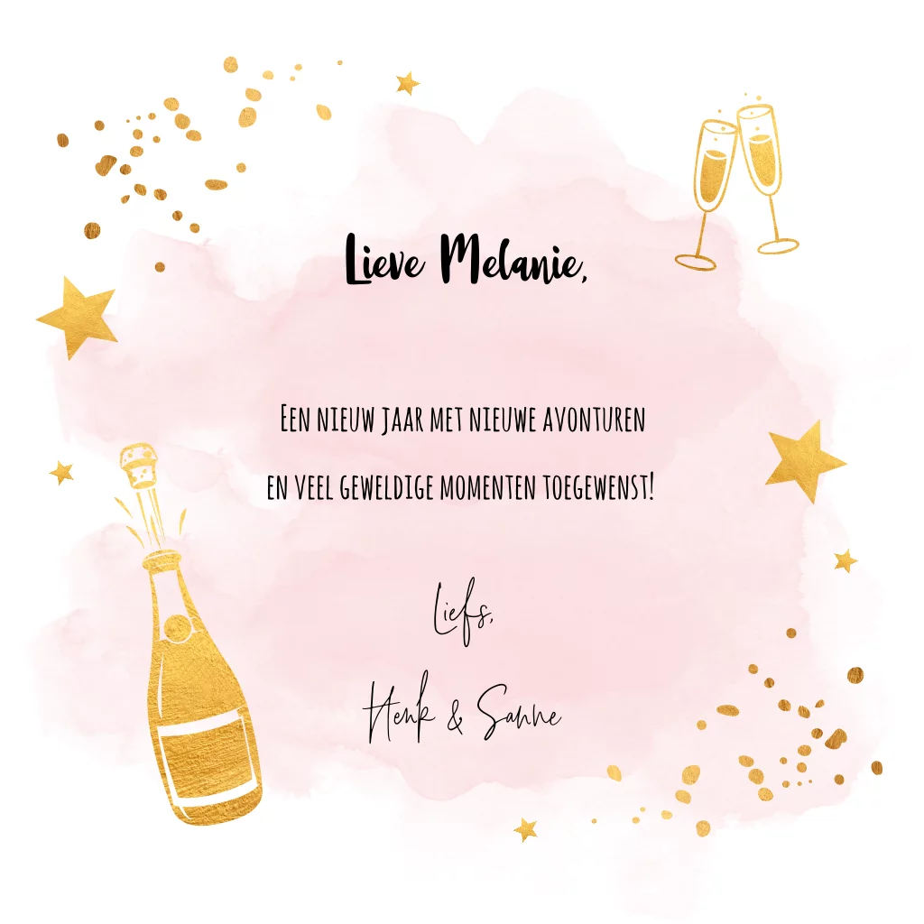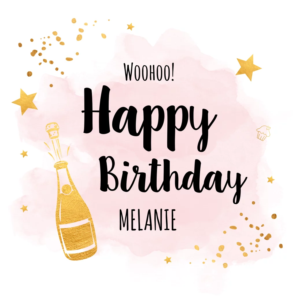 Verjaardagskaart voor een vrouwmet roze watercolor, goud look champagne, sterren en spetters.