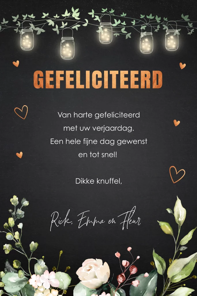 Verjaardagskaart eigen foto zwart bloemen lampjes koperlook