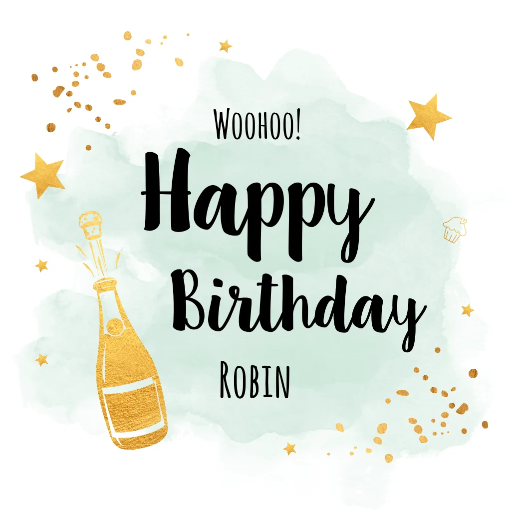 Verjaardagskaart groen met goud look spetters, champagne en sterren.