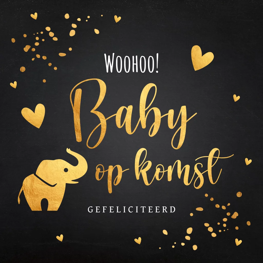 Felicitatiekaart zwangerschap zwart met goudlook olifantje, hartjes en tekst "Baby op komst". Geen goudfolie!