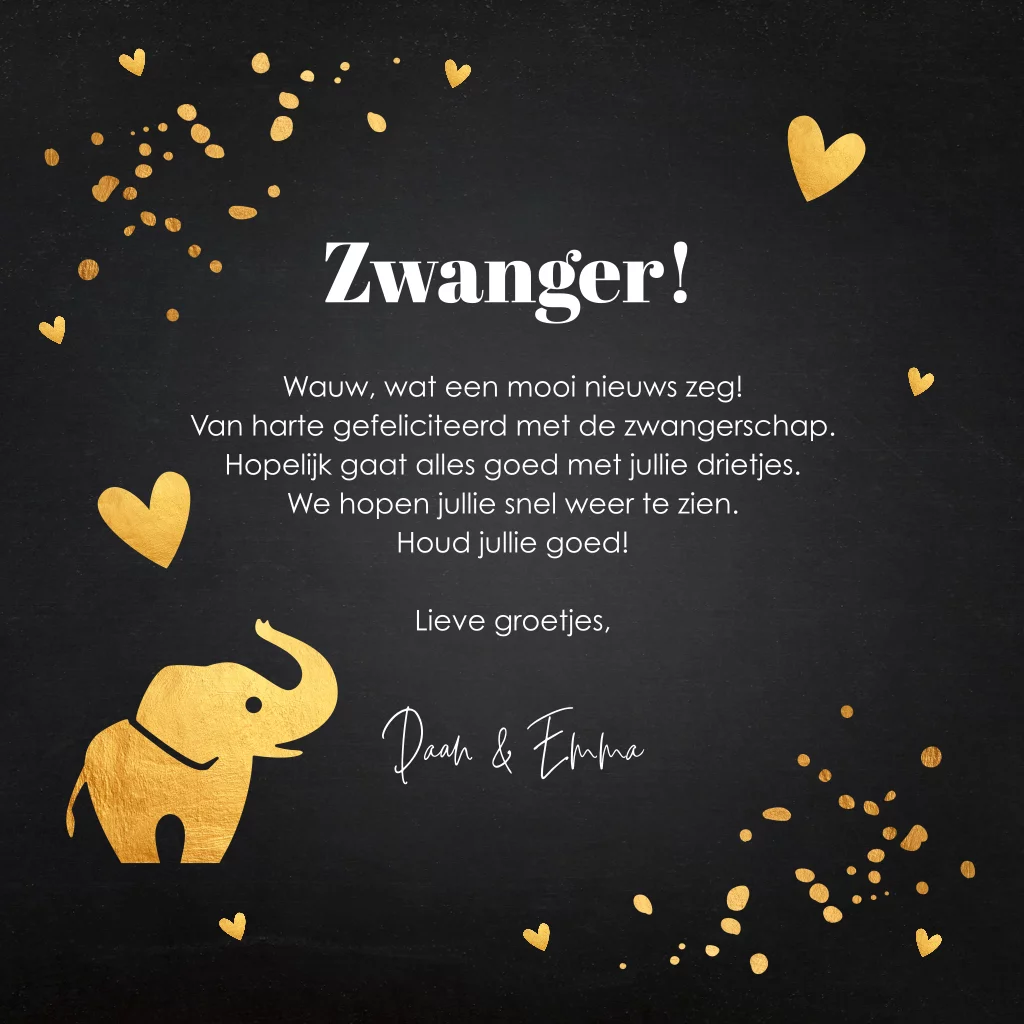 Felicitatie kaart zwangerschap olifantje hartjes zwart goudlook