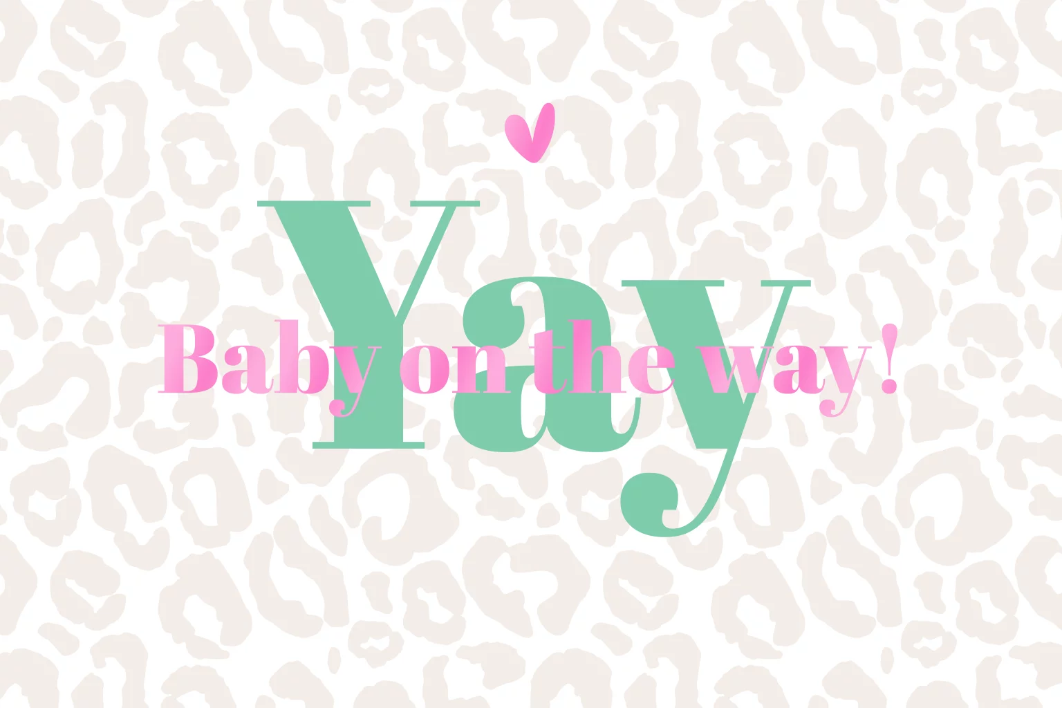 Felicitatie kaart zwangerschap panterprint beige baby on the way in hoogglans roze.