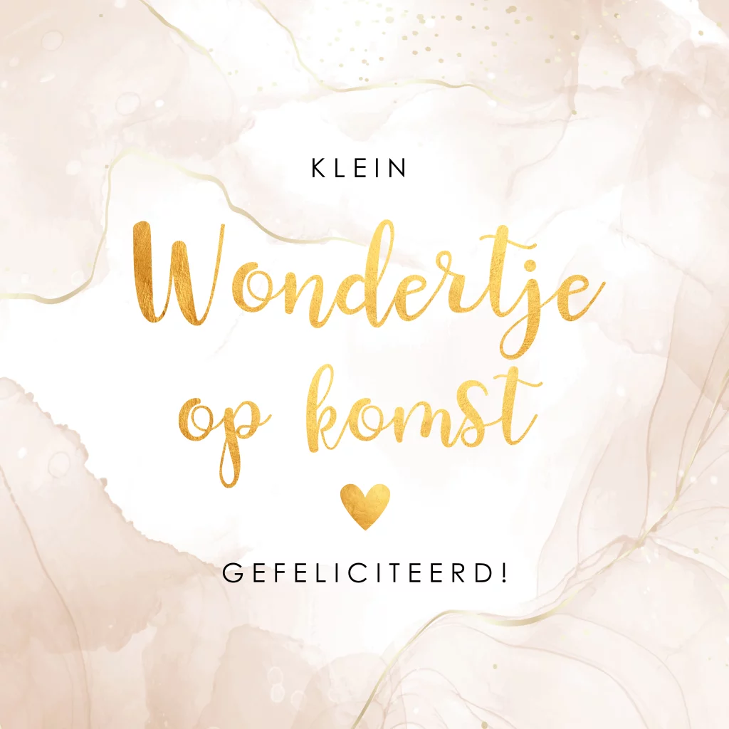 Felicitatie kaart zwangerschap met beige marmerlook, typografie en goudlook hartjes. Geen goudfolie! Klein wondertje op komst!