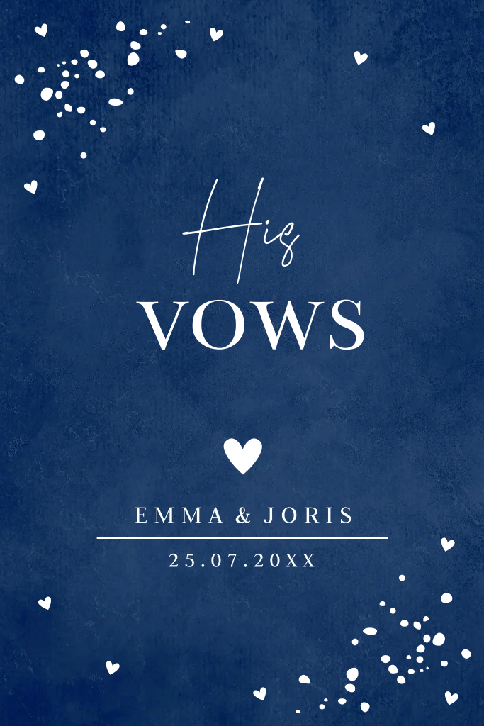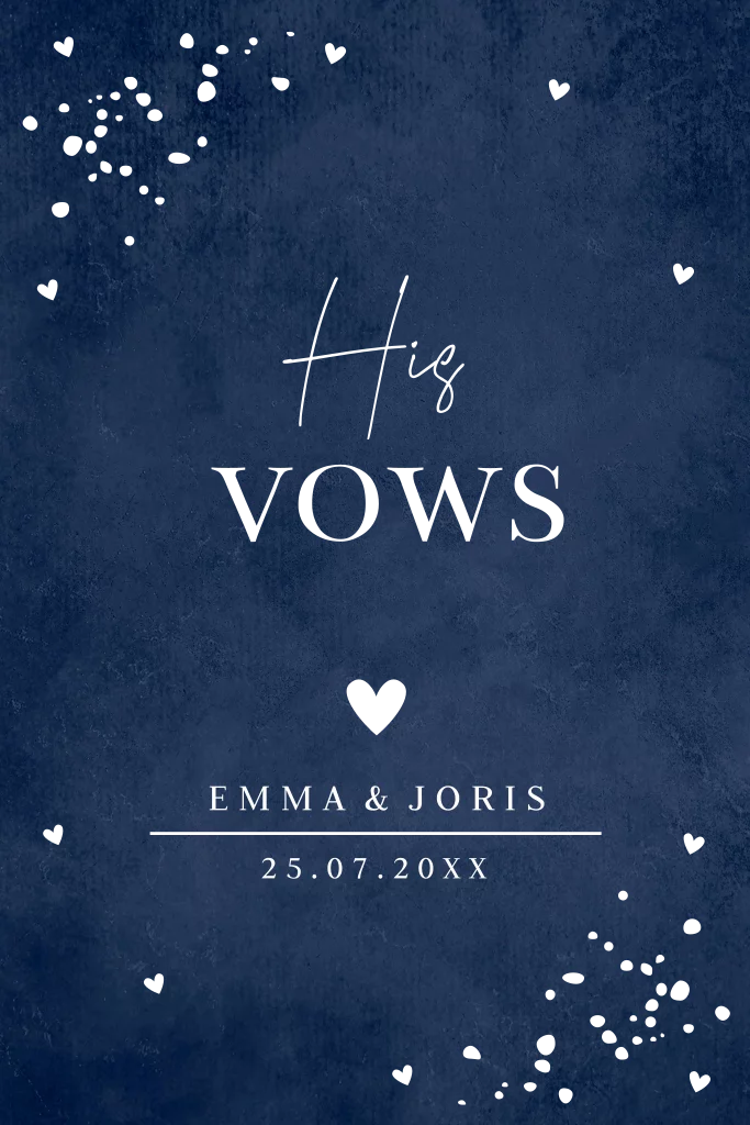 Stijlvolle geloftenkaart blauw met spetters, hartjes en goudfolie. In een handige gelofteboekje kun je jullie geloften opschrijven. Zo vergeet je niet wat je wilde zeggen.
