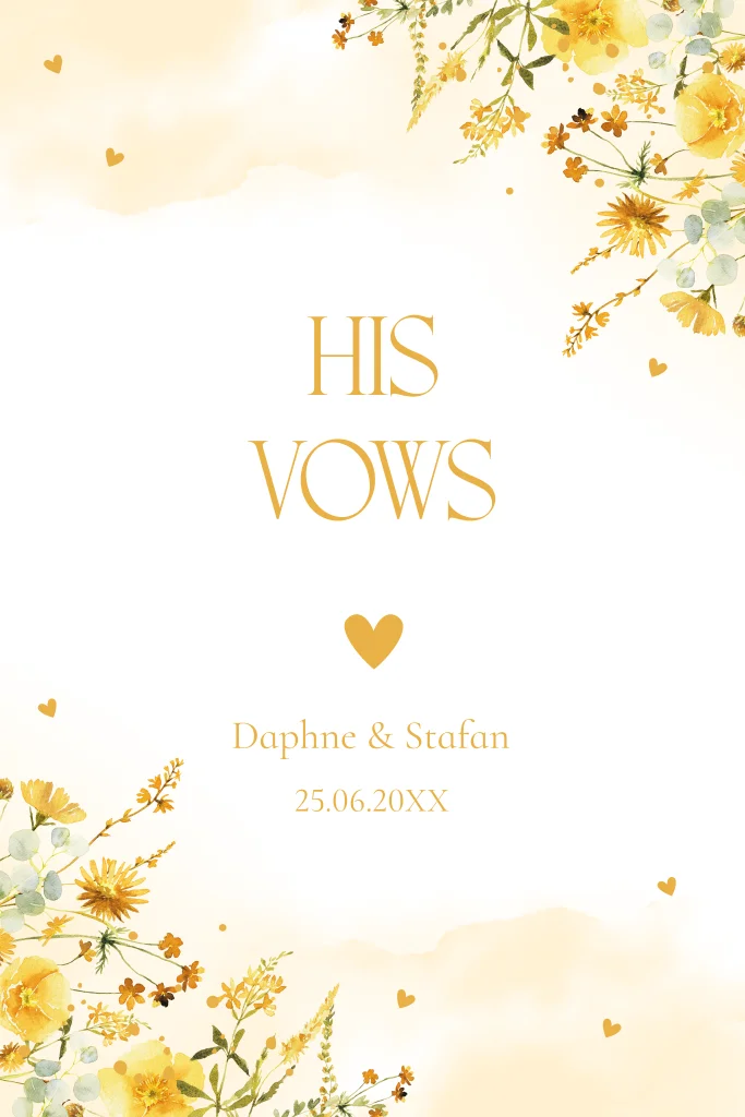 Geloftenkaart met bloemen watercolour geel. In een handige gelofteboekje kun je jullie geloften opschrijven. Zo vergeet je niet wat je wilde zeggen.