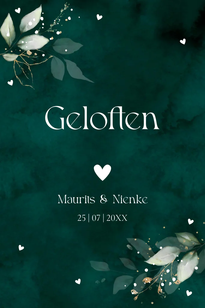 Geloftenkaart groen met botanisch bladeren en goudfolie. In een handige gelofteboekje kun je jullie geloften opschrijven. Zo vergeet je niet wat je wilde zeggen.