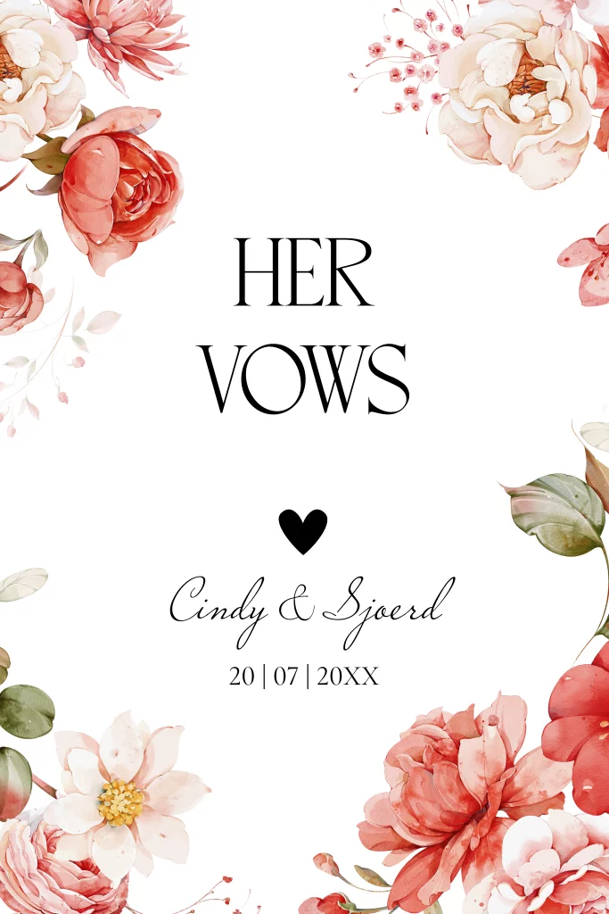 Geloftenkaart met watercolour bloemen rood. In een gelofteboekje kun je jullie geloften opschrijven. Zo vergeet je niet wat je wilde zeggen.