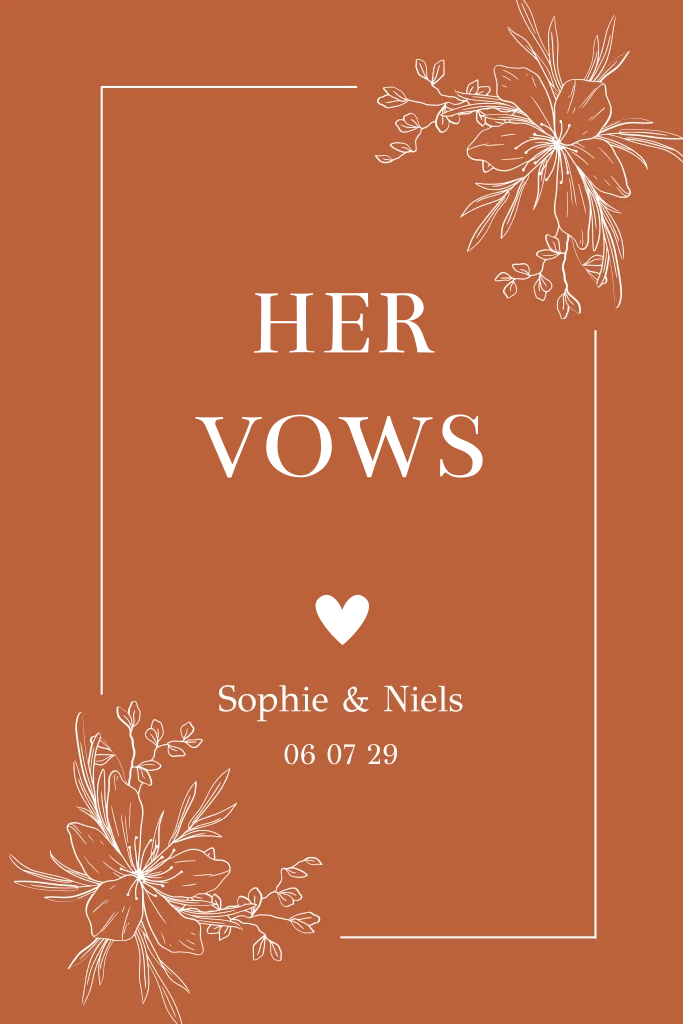 Geloftenkaart huwelijk roestbruin met bloemen frame en goudfolie. Schrijf je geloften in een mooie kaart.