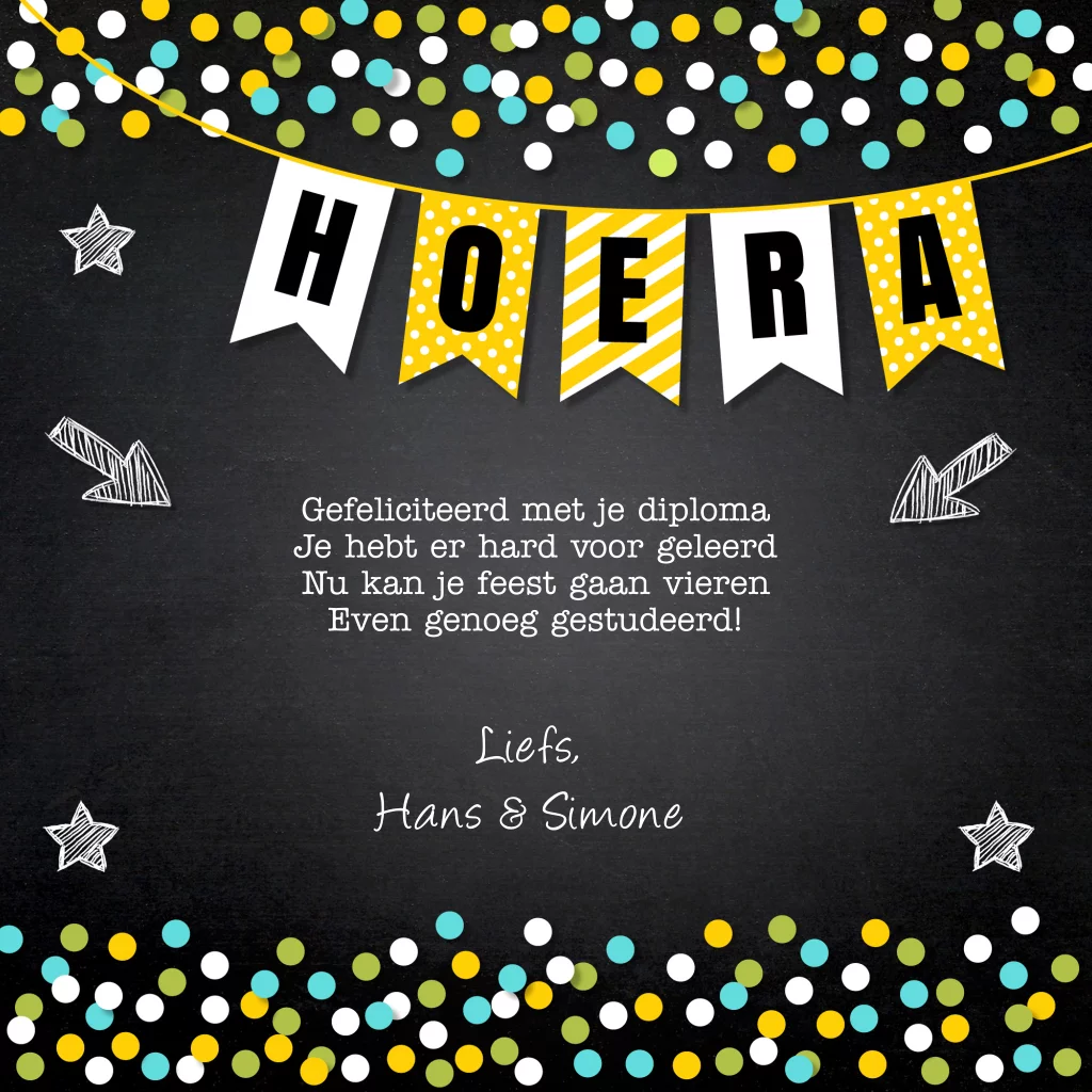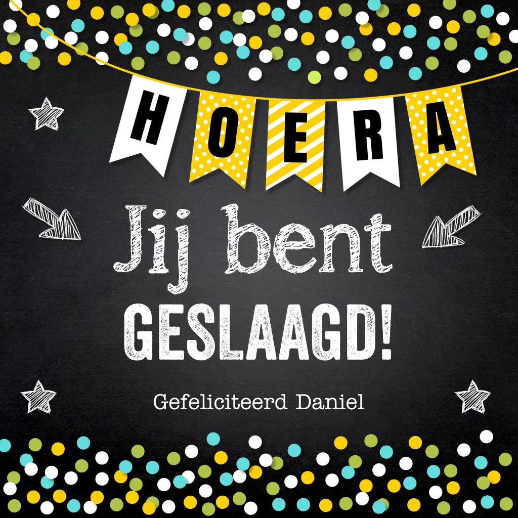 Geslaagd wenskaart met slinger, confetti en krijtbordprint.