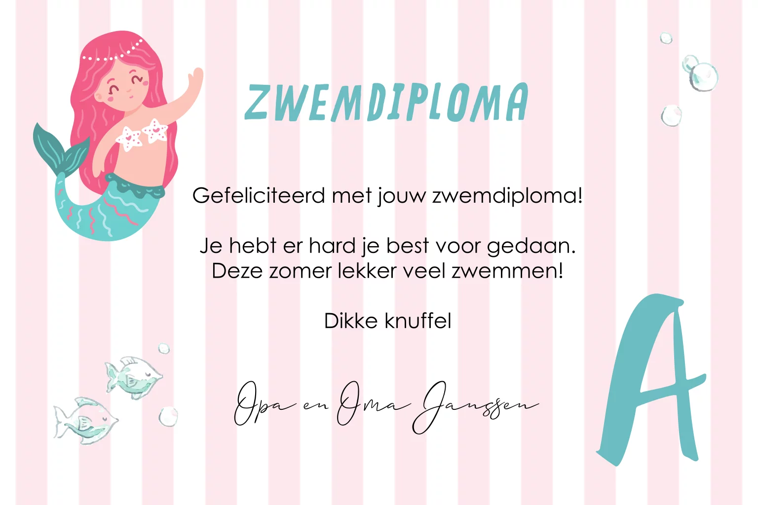 Felicitatie kaart zwemdiploma A voor een meisje met zeemeermin.