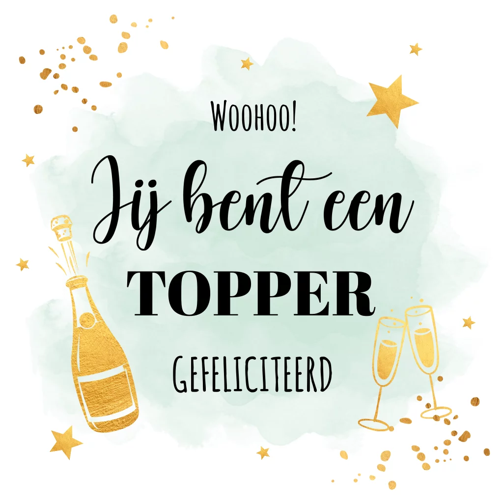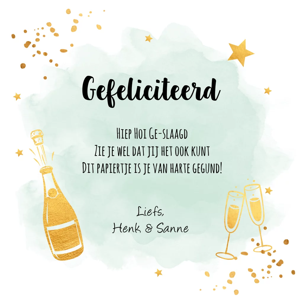 Felicitatie kaart geslaagd diploma waterverf groen goudlook champagne