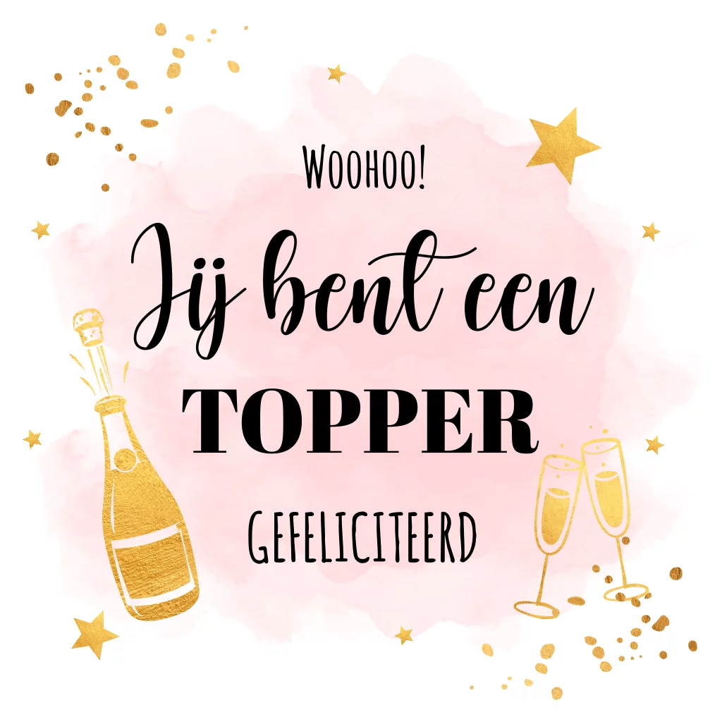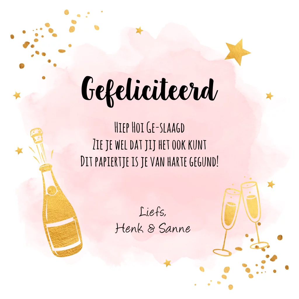 Felicitatie kaart geslaagd diploma met watercolour roze en goudlook champagne.