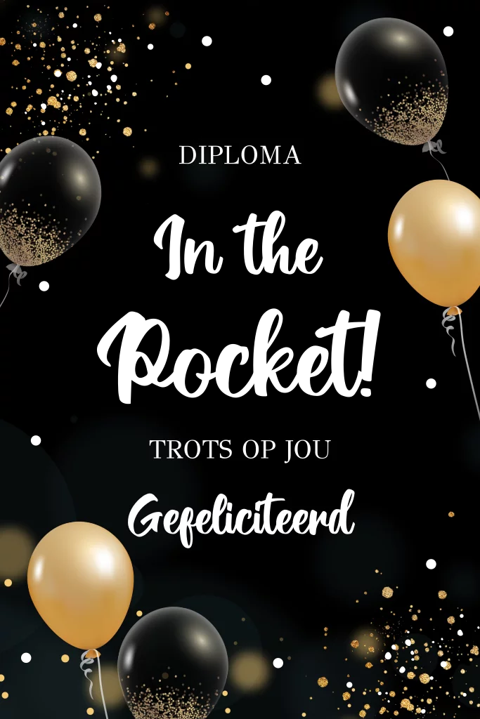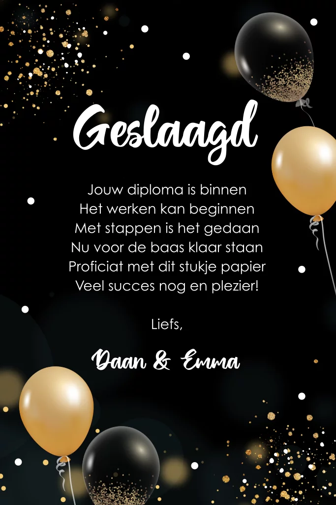 Felicitatie kaart geslaagd diploma ballonnen zwart goudfolie