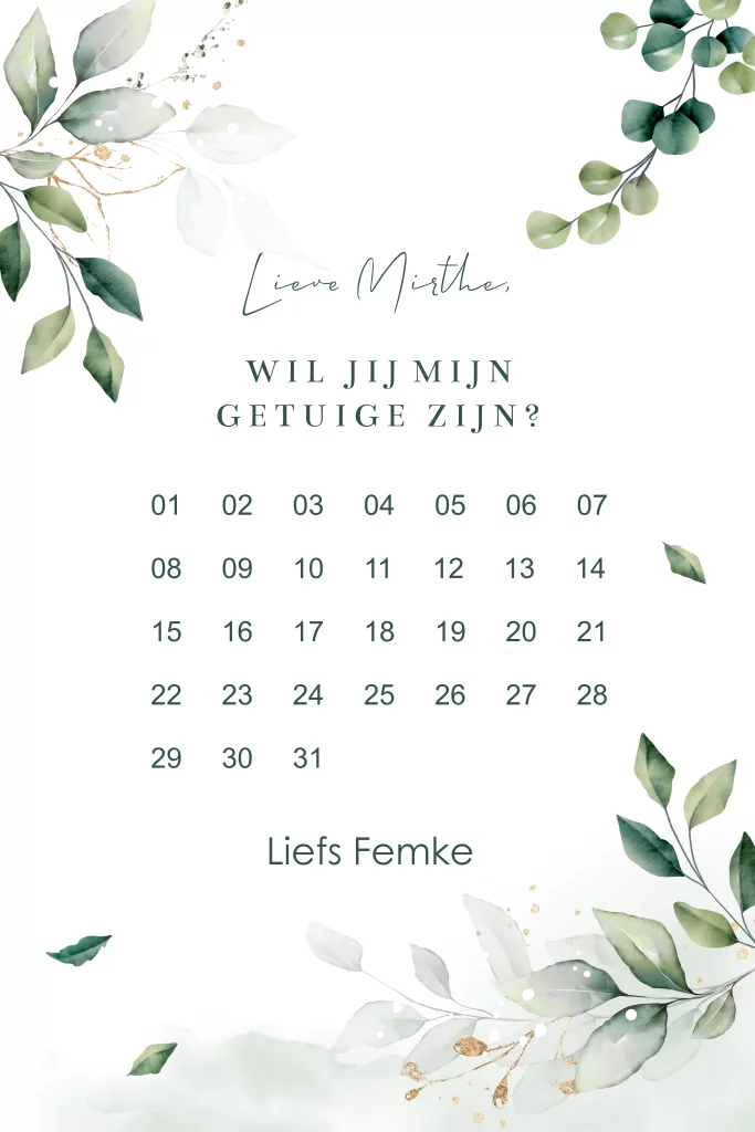 Op zoek naar een leuke kaart om je getuige te vragen? Ga voor dit stijlvolle kaartje met groene blaadjes en kalender met rosegoudfolie! Je kunt zowel het design als de datum aanpassen in de online editor.
