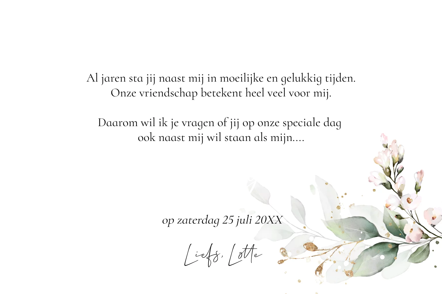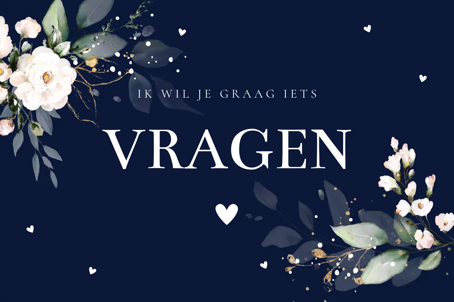 Een mooie kaart om jouw beste vriendin of zus getuige te vragen voor jullie huwelijk. Donkerblauw met watercolour bloemen wit, goudfolie en ringen.