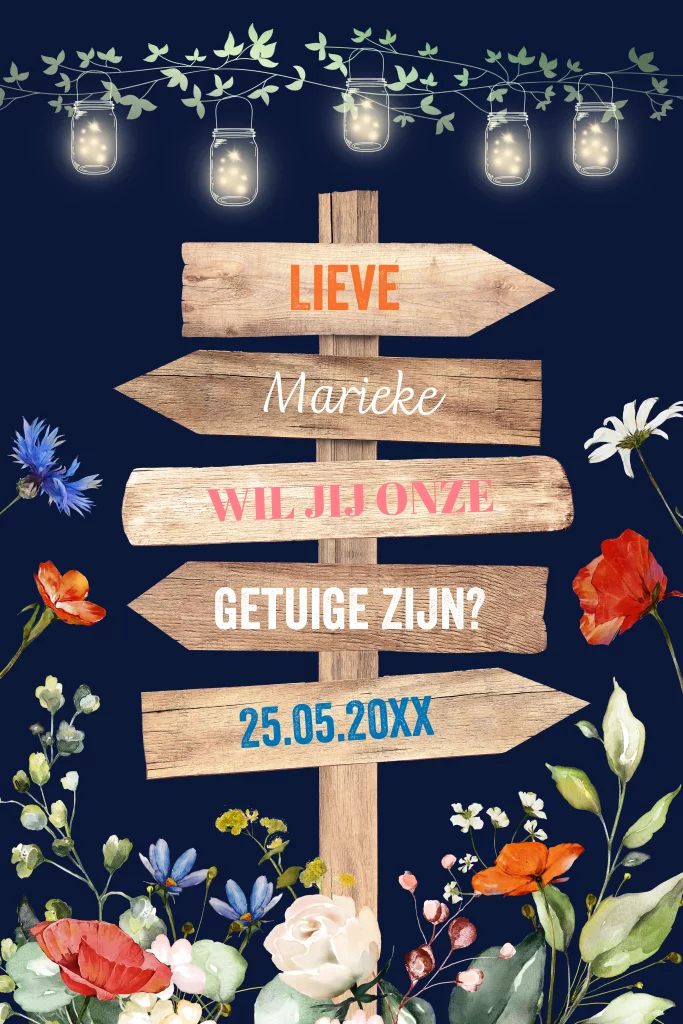 Getuigekaart met houten wegwijzer, gekleurde zomerse bloemen en tekst "Wil jij mijn getuige zijn?".