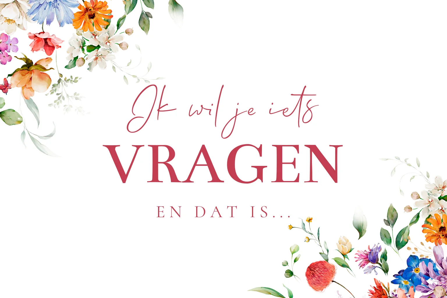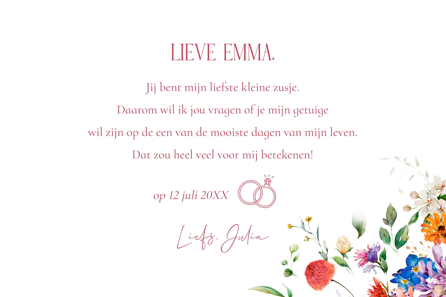 Leuke kaart om je zus of vriendin als getuige te vragen op jullie bruiloft. Vraag je getuige op een speciale manier met deze roze getuigekaart met bloemen in verschillende kleuren en goudlook. Geen folie!
