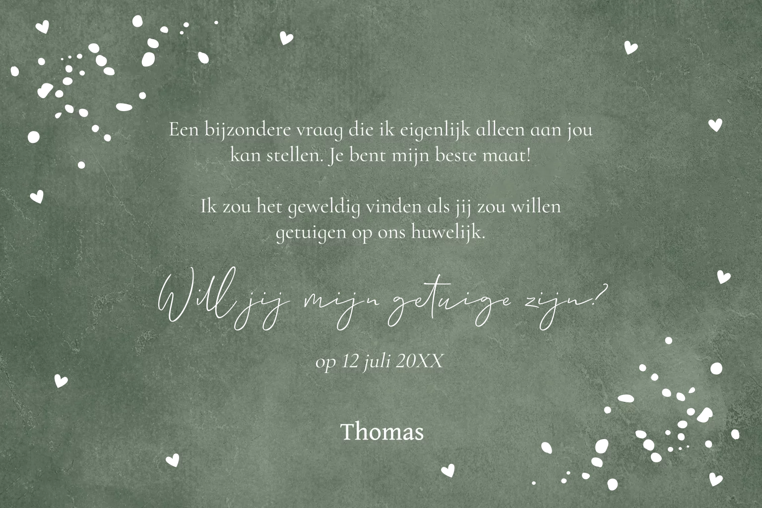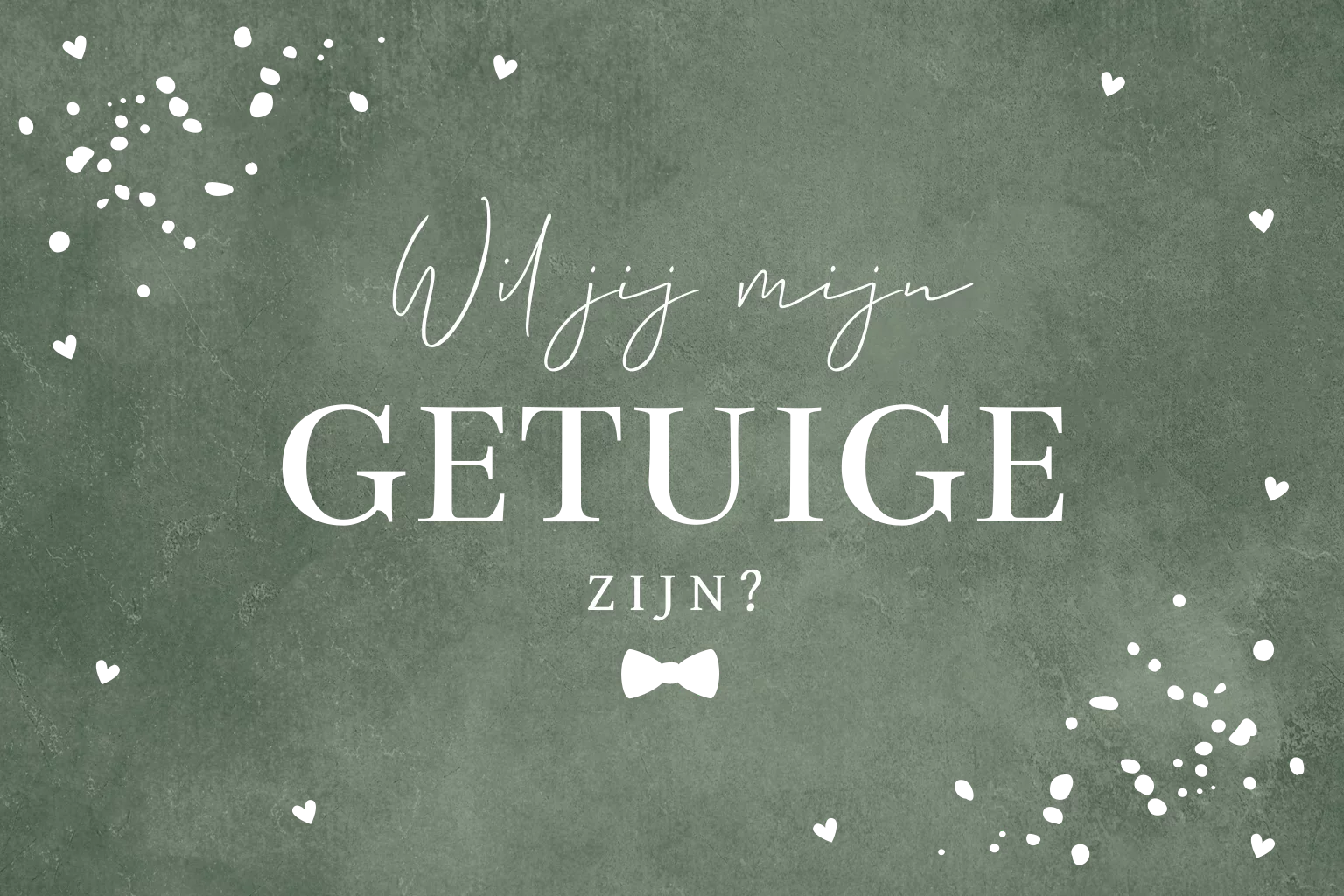 Een grappige kaart om jouw beste vriend getuige te vragen voor jullie huwelijk. Groen met goudfolie, strikje en spetters.