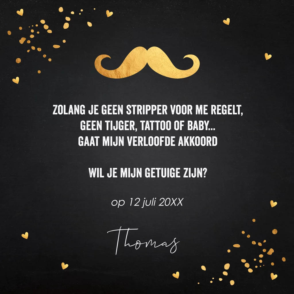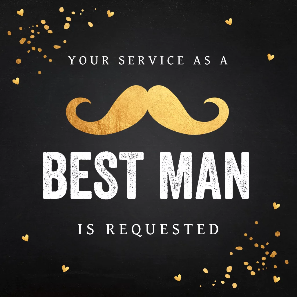 Een grappige kaart om jouw beste vriend getuige te vragen voor jullie huwelijk. Vraag je vriend op een speciale manier getuige voor jouw huwelijk met deze zwarte kaart met "Your service as a best man is requested" en goudlook snor! Geen foliedruk.
