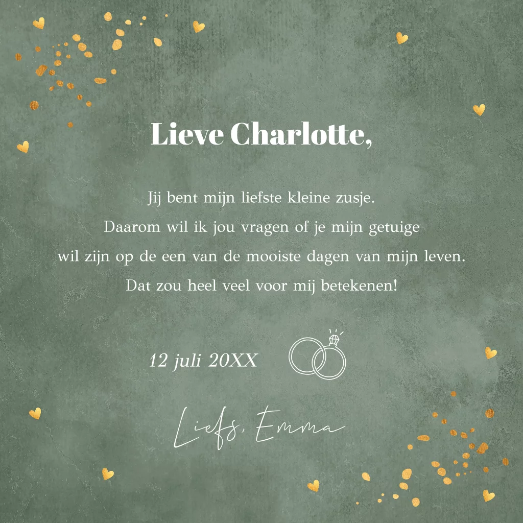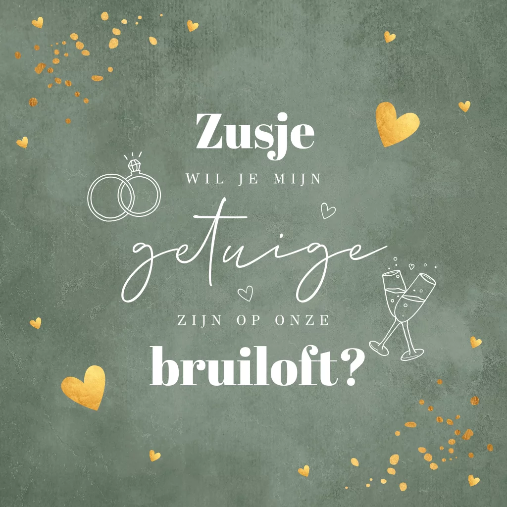 Leuke kaart om je zus als getuige te vragen op jullie bruiloft. Vraag je getuige op een speciale manier met deze groene getuigekaart met trouwringen, champagneglazen en goudlook hartjes. Geen folie!