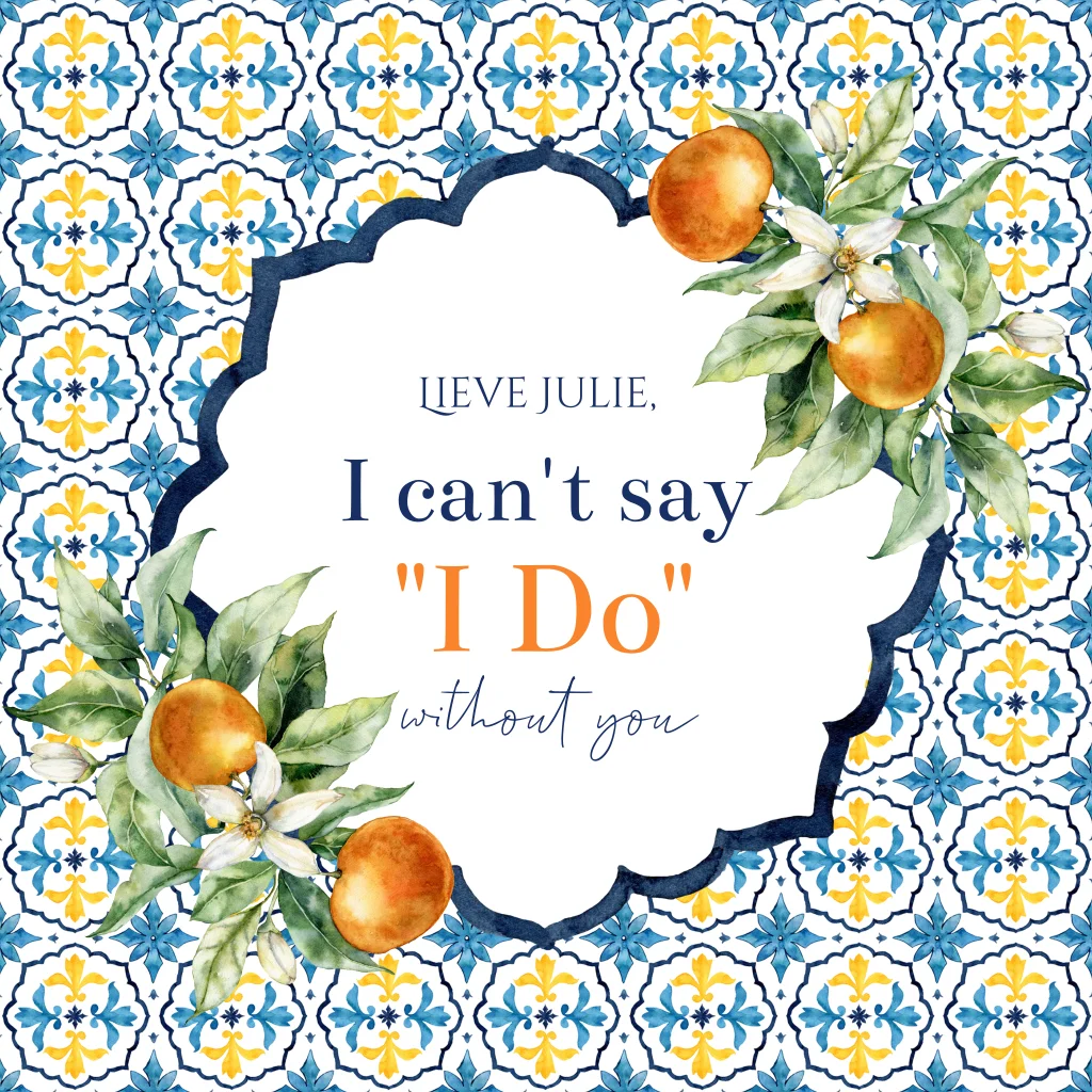 Een mooie kleurrijke kaart met Mediterraans patroon om iemand als getuige te vragen voor je huwelijk.