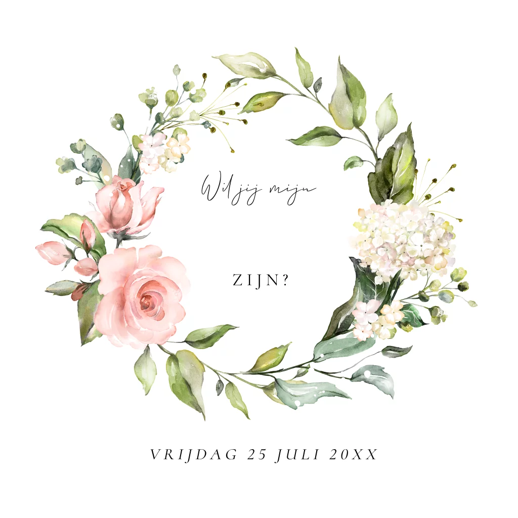 Een stijlvol kaartje om iemand als getuige te vragen voor jullie huwelijk. Met watercolour bloemenkrans en goudfolie.