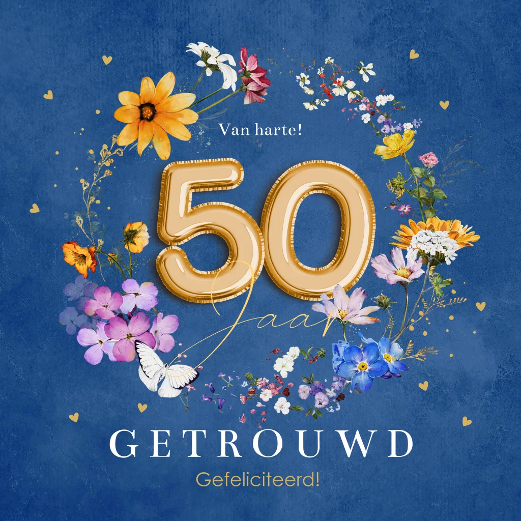 Felicitatie huwelijksjubileum 50 jaar getrouwd blauw met zomerse bloemenkrans.
