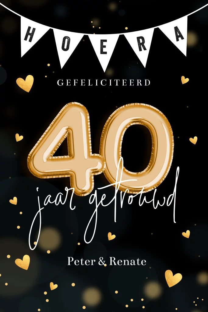 Felicitatie huwelijksjubileum 40 jaar getrouwd zwart met ballonnen, slinger en goudlook.