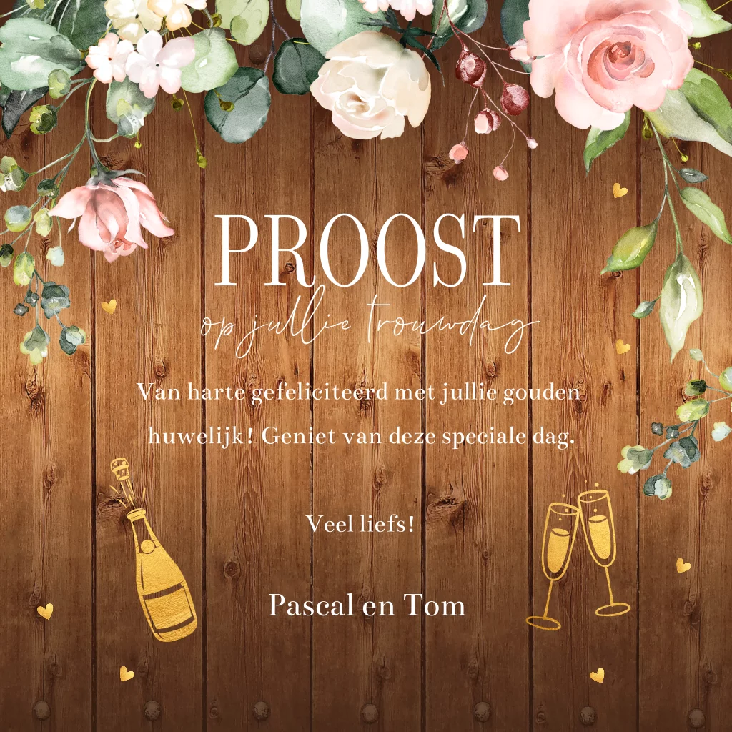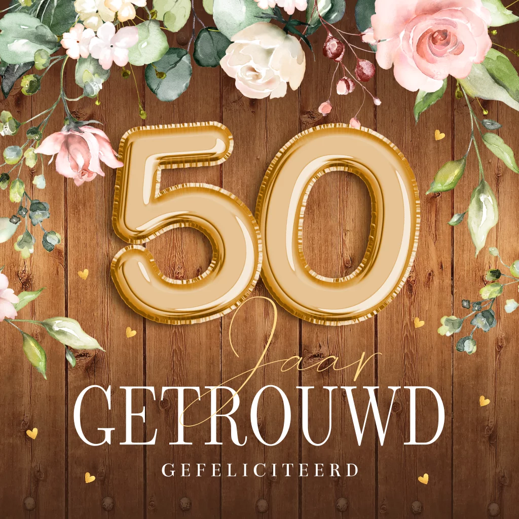 Felicitatie jubileum 50 jaar getrouwd bloemen houtlook