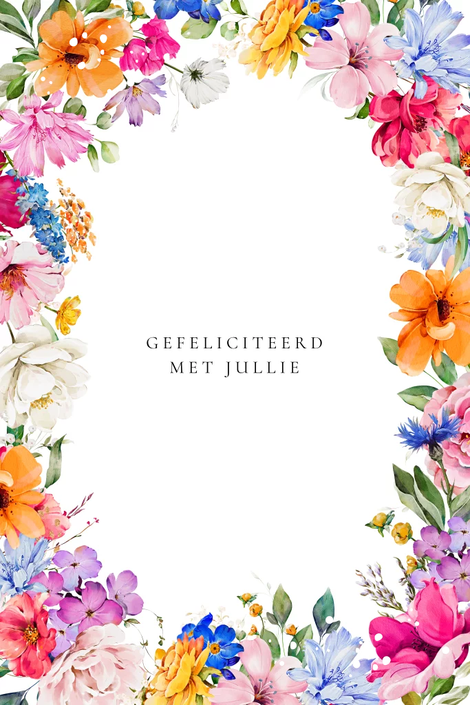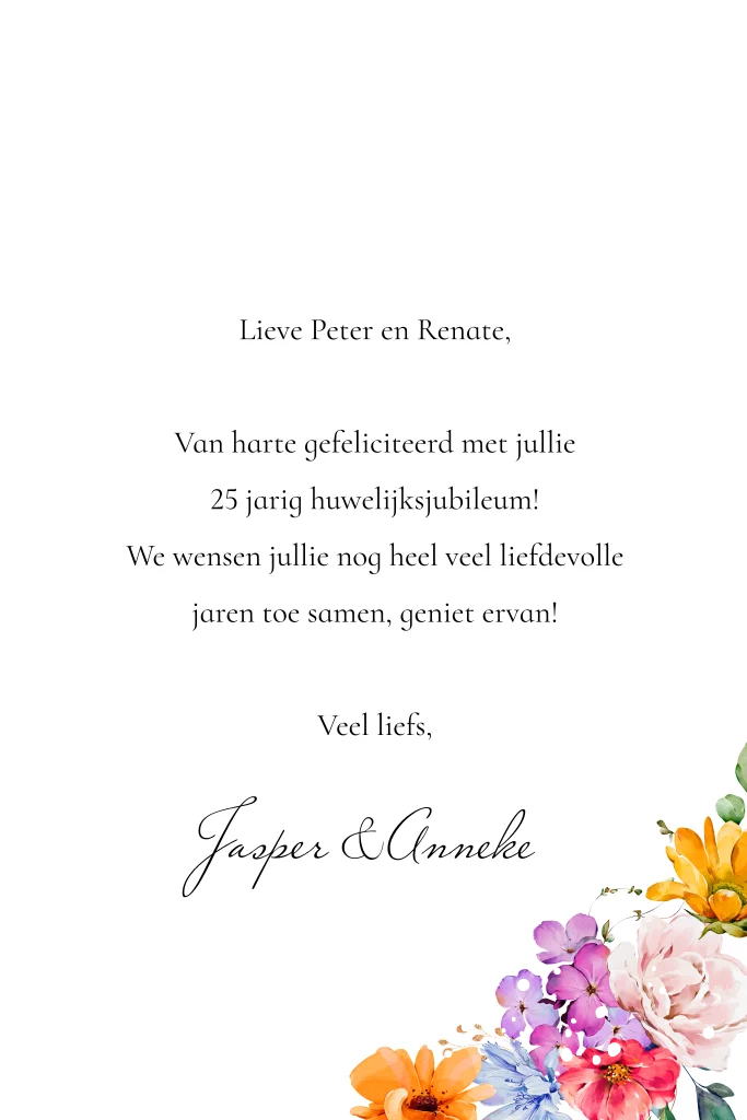 Felicitatie huwelijksjubileum met kleurrijke bloemen en goudfolie.
