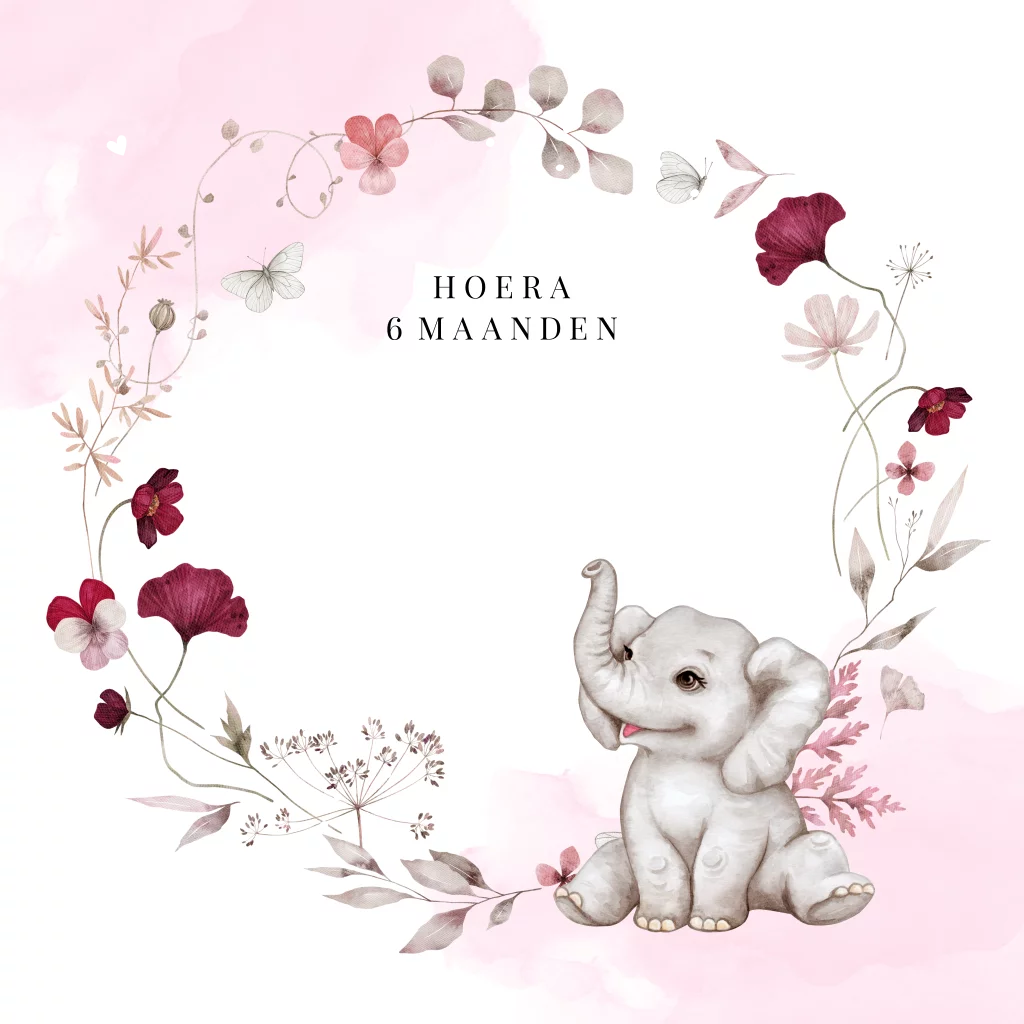 Mijlpaalkaart baby eerste jaar olifantje meisje bloemen roze goudfolie