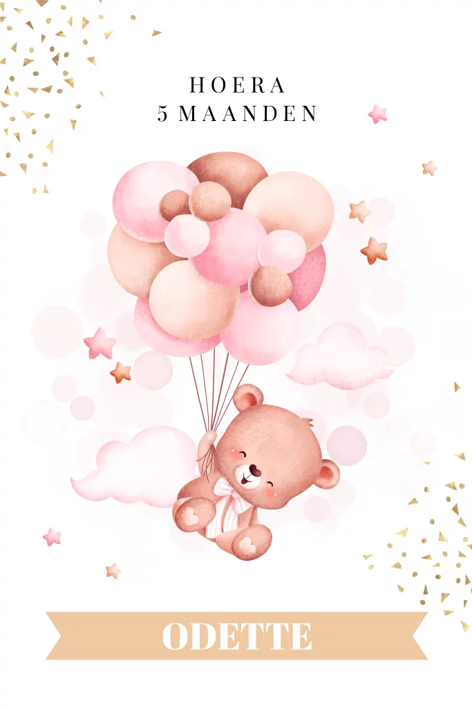 Mijlpaalkaart baby eerste jaar meisje beertje roze ballonnen