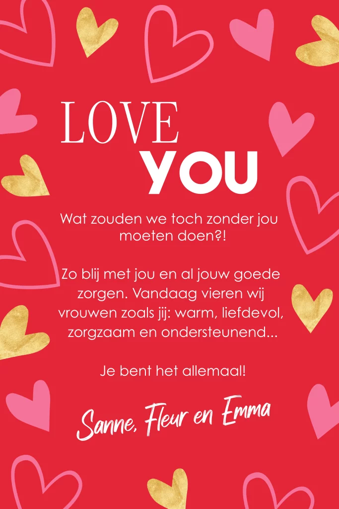 Moederdagkaart voor oma rood met fotocollage, love you en hartjes.