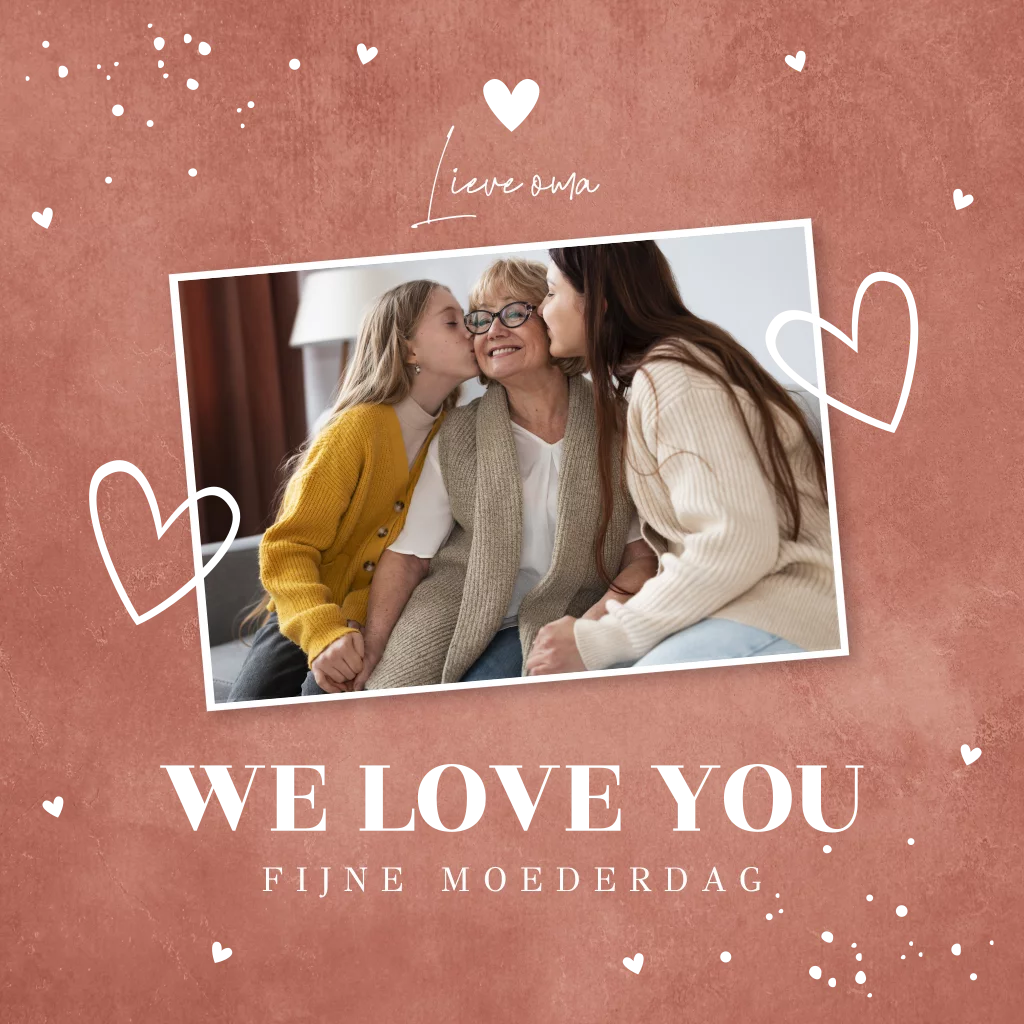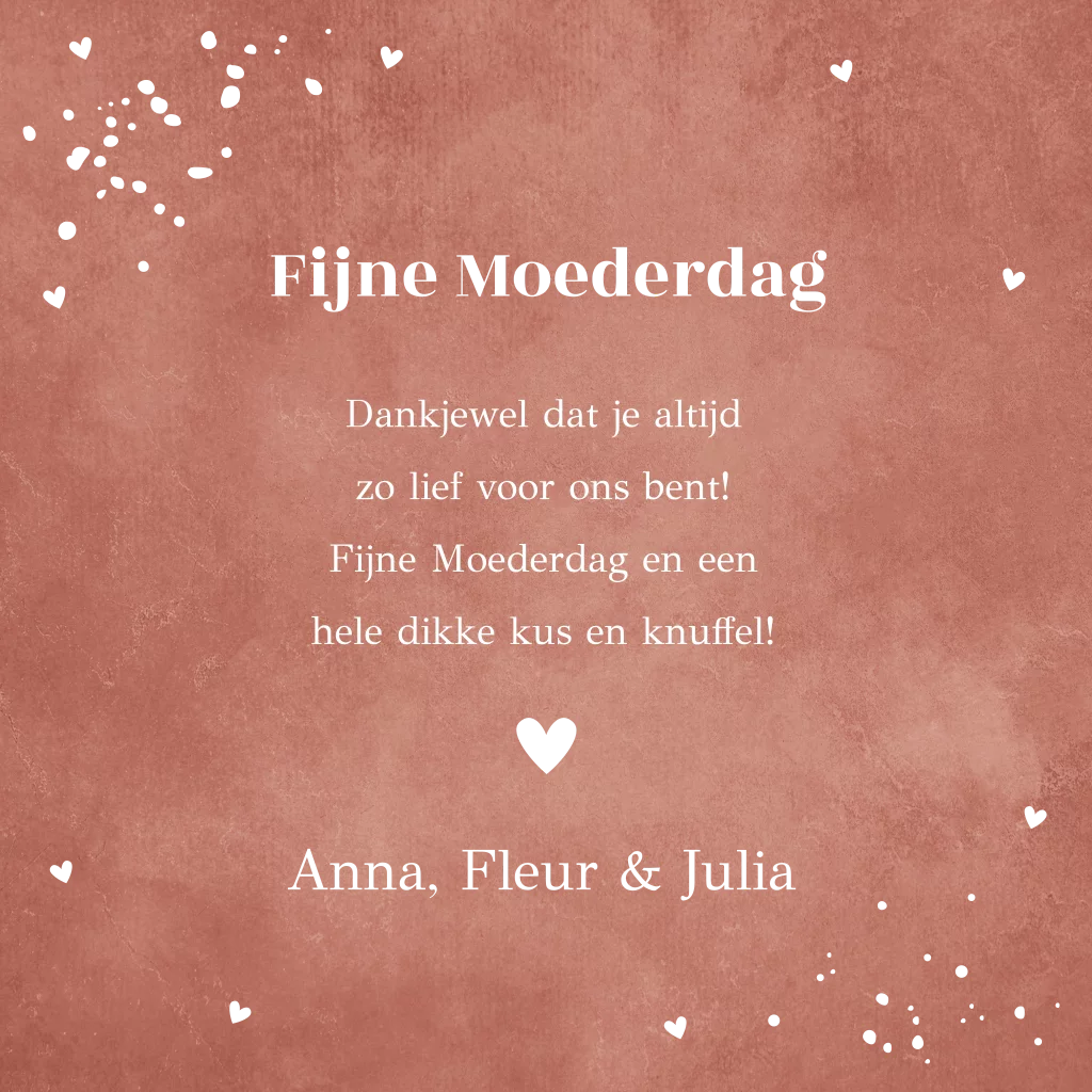 Moederdagkaart terraroze met foto en goudfolie hartjes.