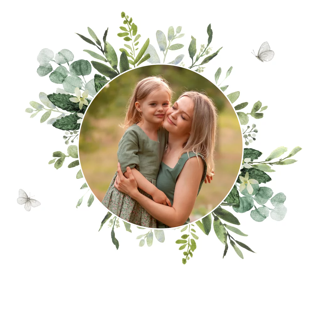 Moederdagkaart met foto, goudfolie en botanische groene bladeren.