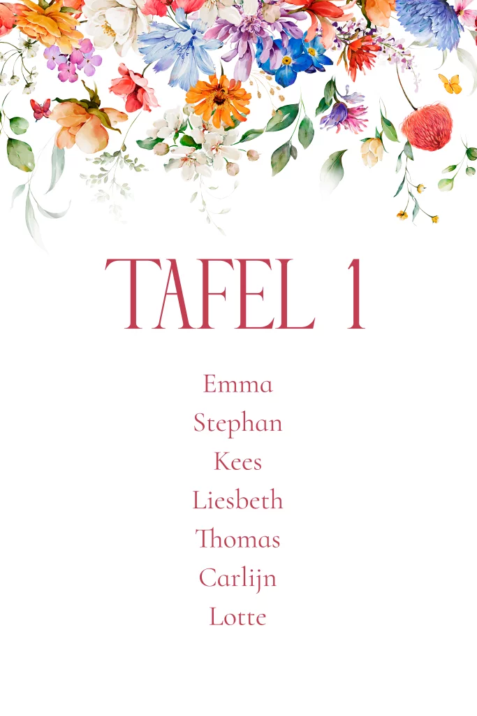 Tafelkaart bruiloft zomerse kleurrijke bloemen