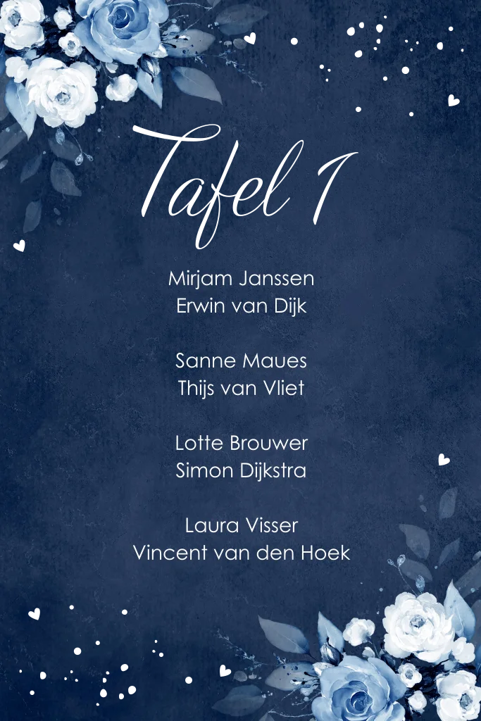 Dit mooie tafelnummerkaartje kun je op tafel plaatsen voor de gastenindeling tijdens het huwelijksdiner. Pas dan het nummer op dit kaartje aan in de tool en bewaar onder je account. Kopieer het kaartje onder je account en zet het volgende nummer erop.