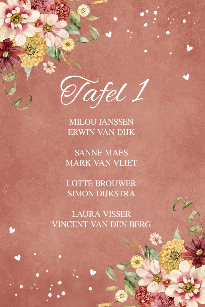 Dit mooie tafelnummerkaartje kun je op tafel plaatsen voor de gastenindeling tijdens het huwelijksdiner. Pas dan het nummer op dit kaartje aan in de tool en bewaar onder je account. Kopieer het kaartje onder je account en zet het volgende nummer erop.