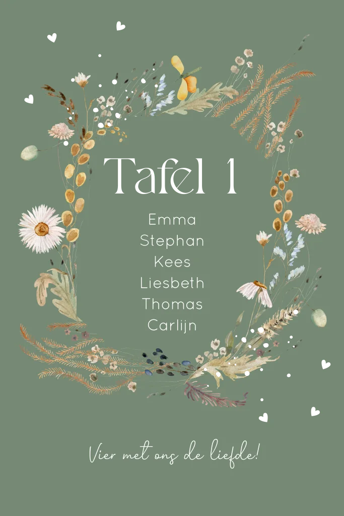 Tafelkaart huwelijk groen bloemenkrans goudfolie
