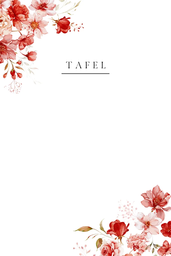 Tafelkaart huwelijk tafelschikking rood bloemen goudfolie