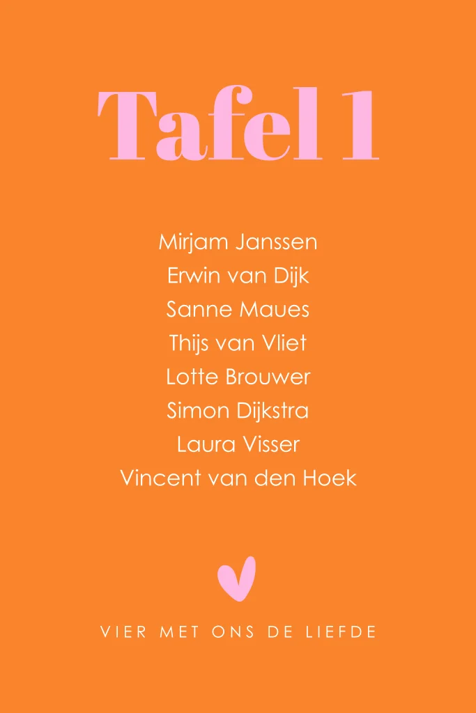 Tafelkaart tafelschikking bruiloft oranje roze modern