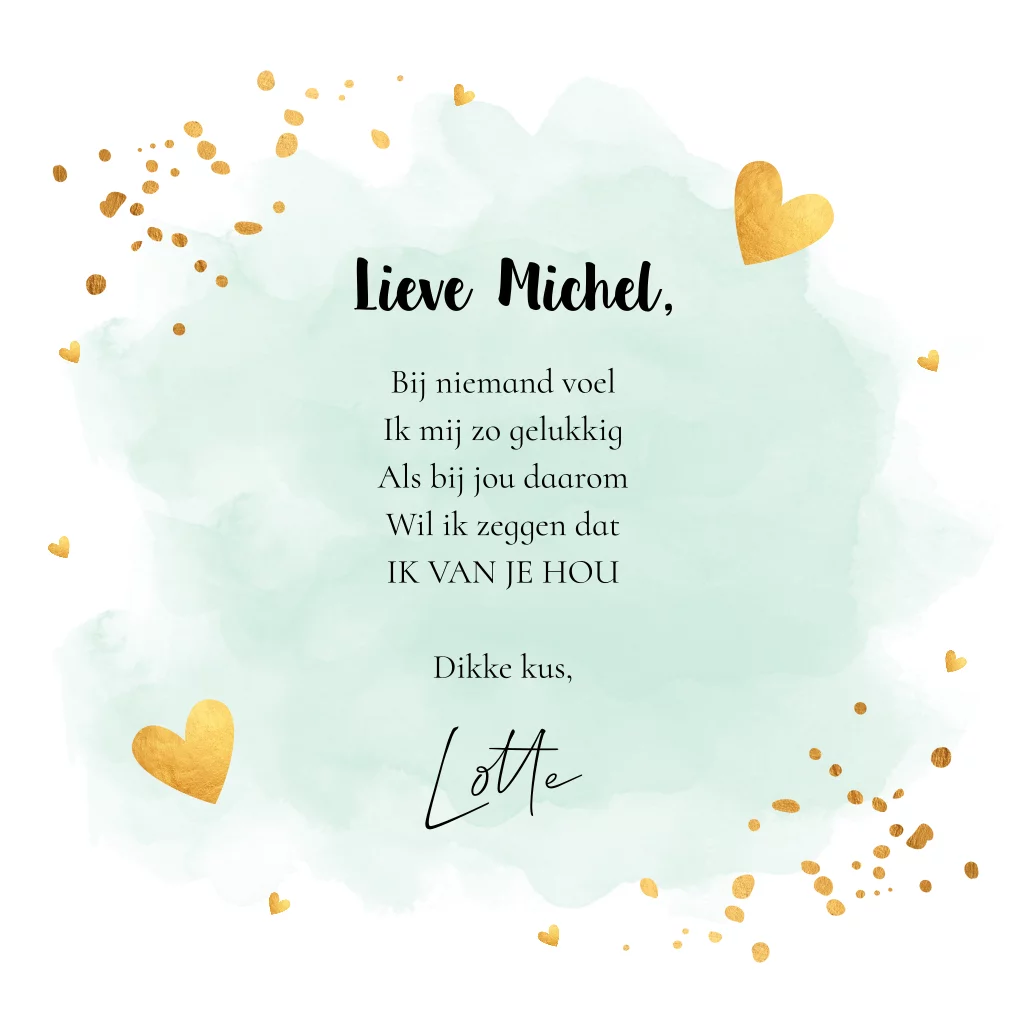 Valentijnskaart mintgroen watercolour met spetters, hartjes en goudlook. Geen folie!