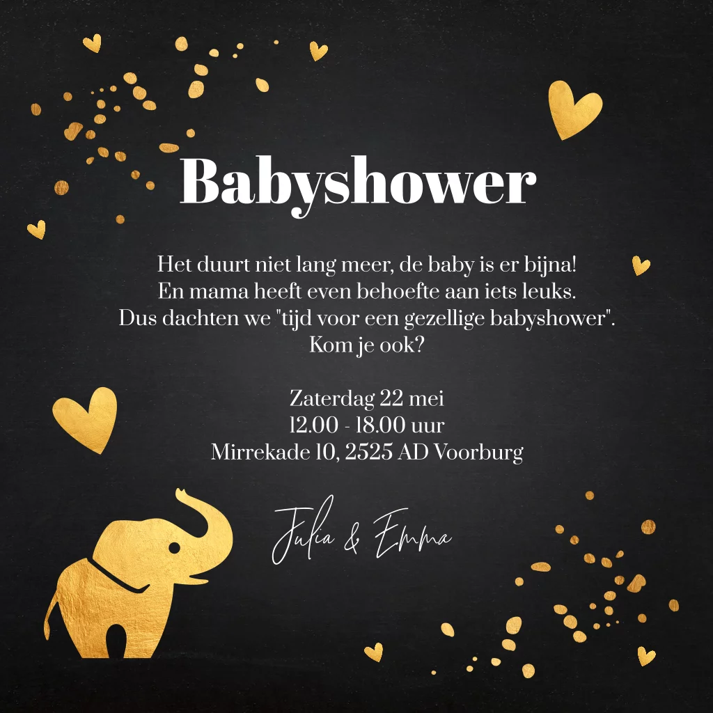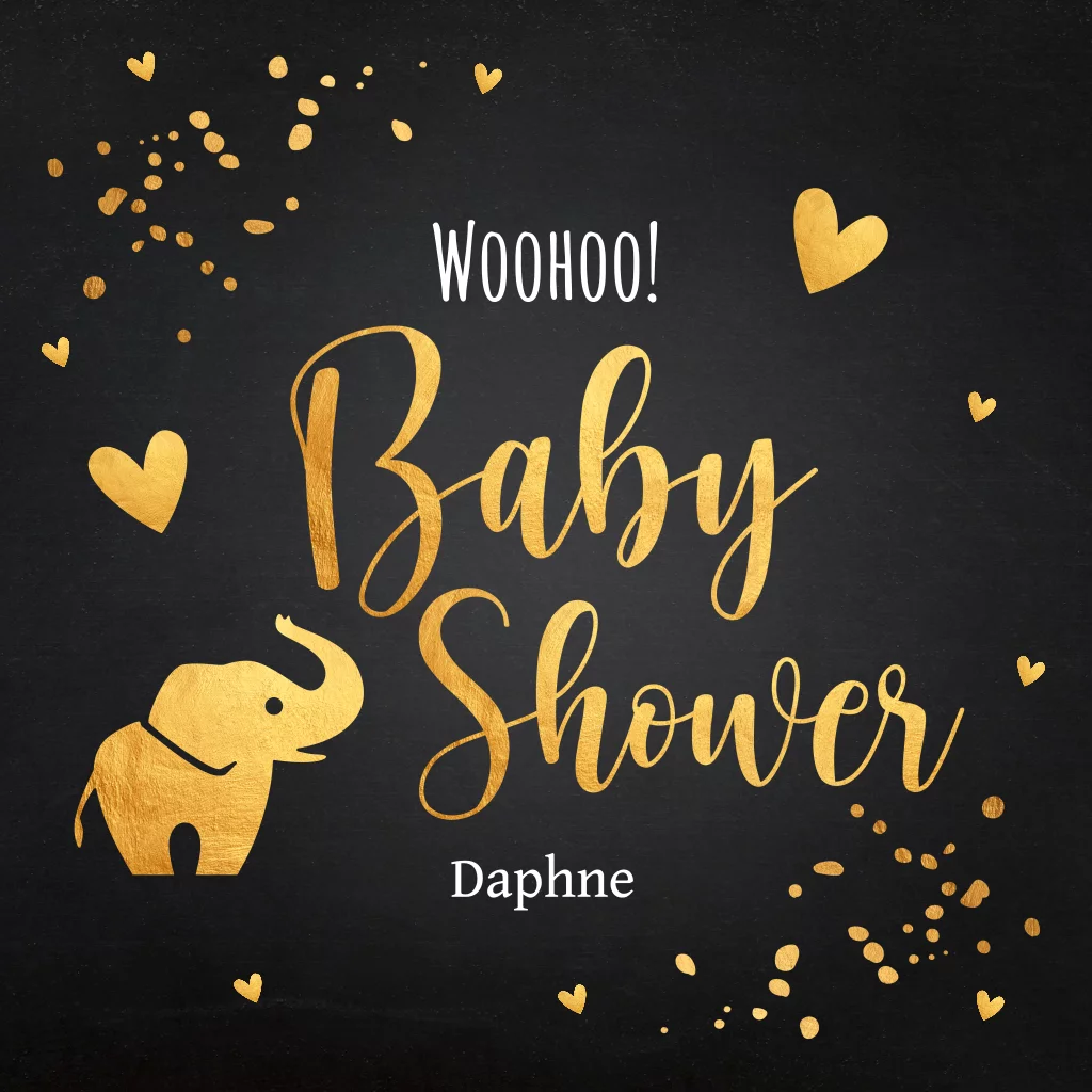 Babyshower uitnodiging kaart zwart met goudlook olifantje, hartjes en tekst. Geen folie!