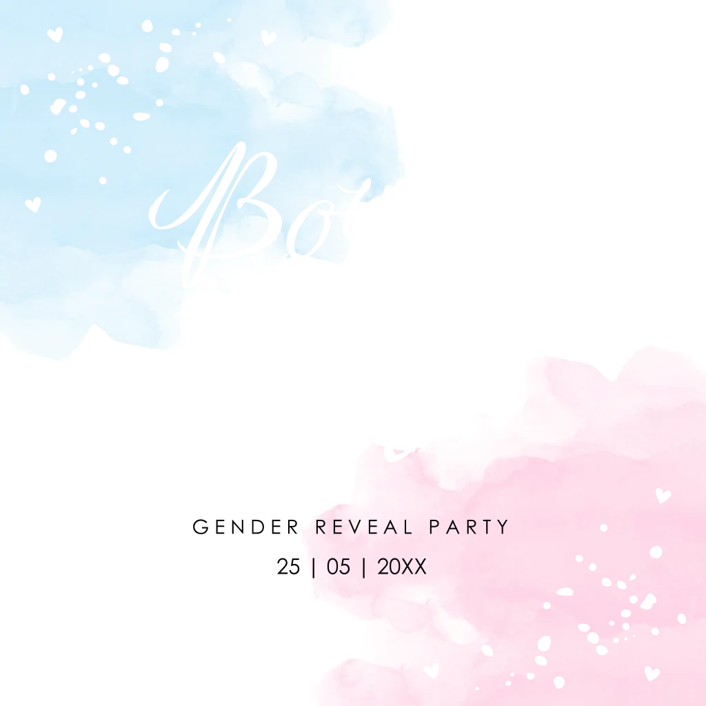 Uitnodiging baby gender reveal party Boy or Girl met watercolour blauw roze en goudfolie.