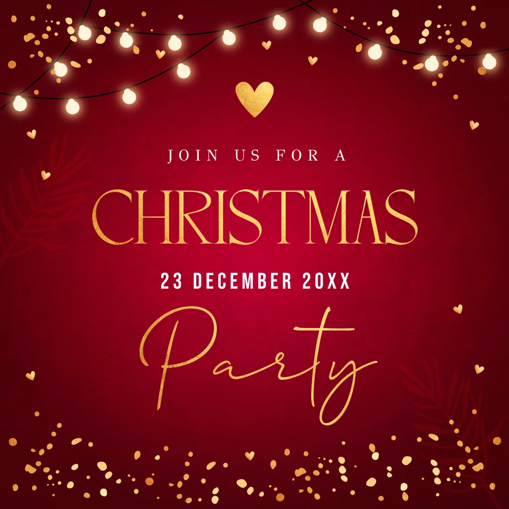 Christmas party invitation rood met sfeervolle lampjes en goud look. Geen folie!