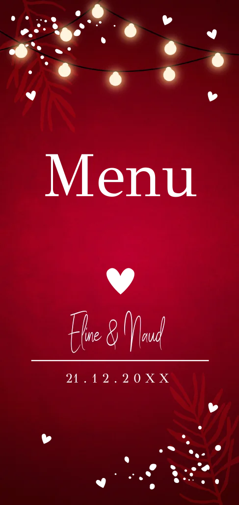 Menukaart langwerpig rood met sfeervolle lampjes, hartjes en goudfolie.